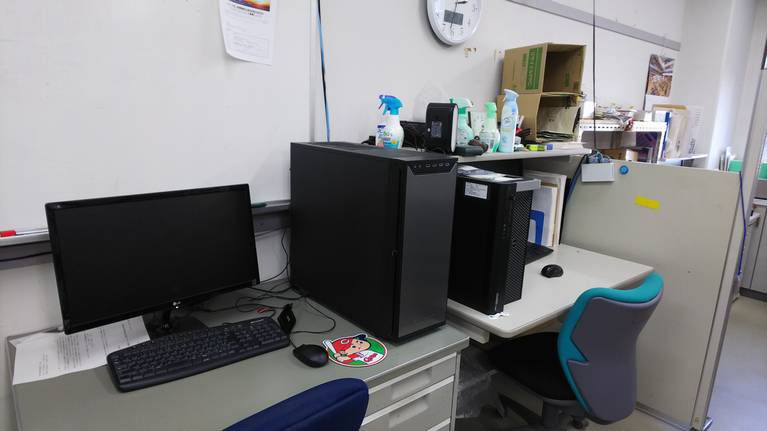 学生一人ずつにデスクがあります。PCを使った計算機シミュレーションや報告書の作成などの研究活動を行っています。